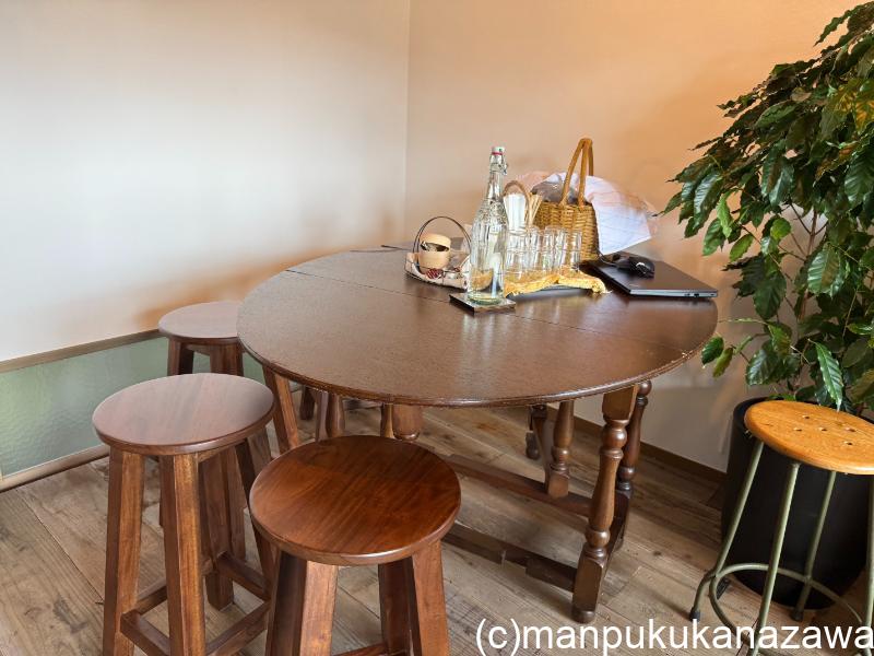 カウンターの横には、ちょっと腰掛けてドリンクなどをいただけるテーブル席。