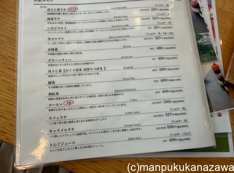 ドリンクもかなり豊富で、コーヒーや緑茶、お抹茶に、日本茶とハーブティーをミックスしたものなどもあります。