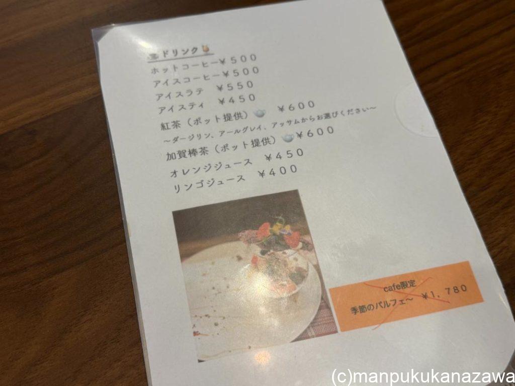 メニューは、ドリンクにコーヒーやポットで提供する紅茶や加賀棒茶などがラインナップ。