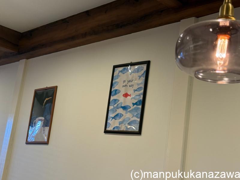 カフェスペースは、飾ってある絵やインテリアもセンスがよくて、白い壁とグリーンのソファ、木のテーブルの組み合わせが居心地のいい空間。
