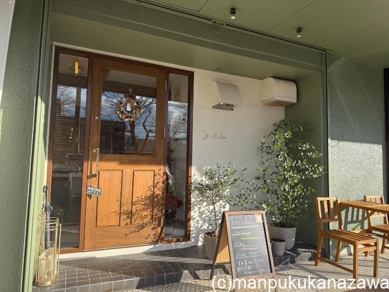 いくつかのテナントが入る建物のうちの、木の扉がかわいい店構えのパティスリーカフェです。