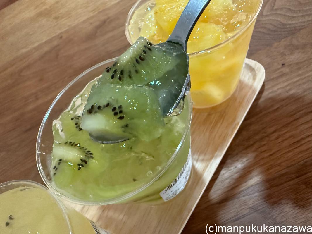 ふるふるのゼリーとフルーツを合わせていただくと、爽やかで甘すぎなくて、さっぱり美味しい♪まだまだ暑いこの季節にぴったりだね。