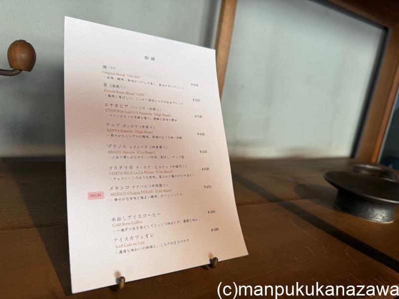 メニューは自家焙煎の豆を使ったコーヒーが7種類。アイスやカフェオレもあります。