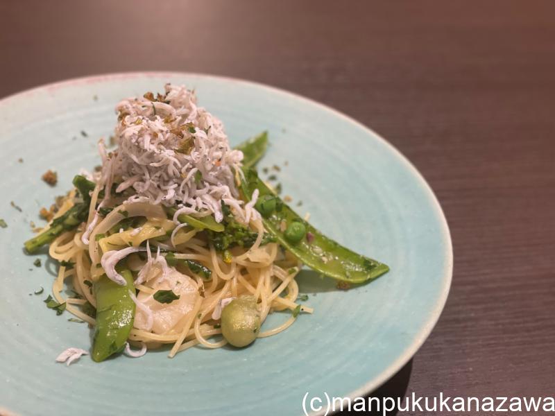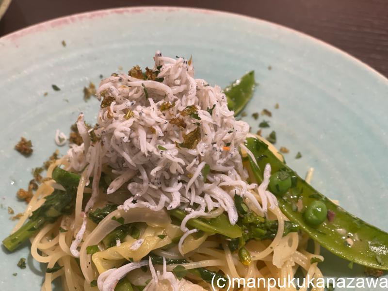 釜揚げしらすと春野菜のペペロンチーノ ふきのとうの香り(+880円)